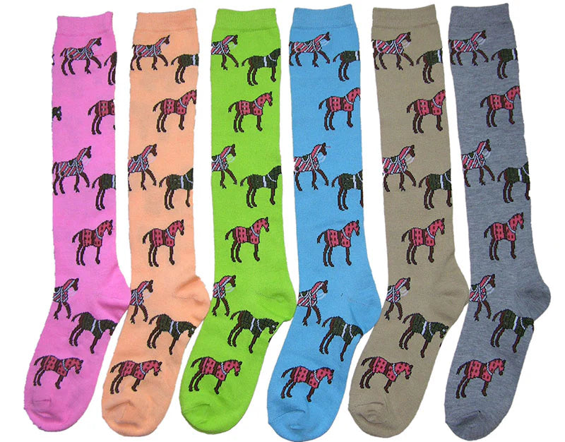 Ladies' Knee Socks - Horses with Blankets Wild West Living will make the selection of the color based on a proprietary algorithm.  You can call and specify the color you want but no guarantee.