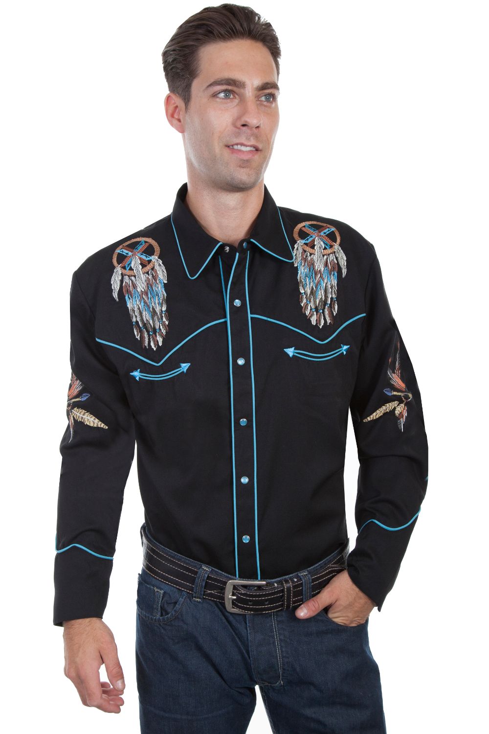 Poly/rayon blend snap front and cuff shirt. Embroidered indream catcher in on front yokes and the back yoke features a skull with head dress and tomahawks. Contrast piping throughout. Machine wash cold and hang dry.