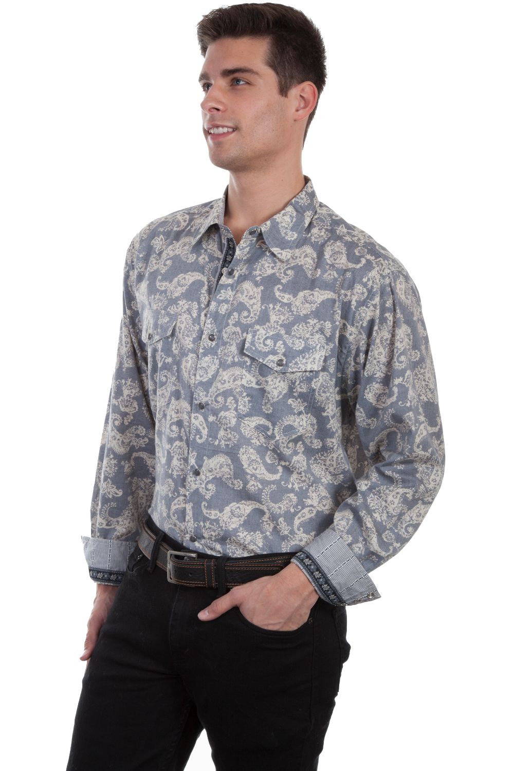 Signature series shirt. This subtle blue paisley shirt features a snap front closure with two chest snap flap pockets and point collar. Enhancing contrast trim with ribbon is on placket inside collar and cuffs. 100% cotton. Machine wash cold and tumble dry low. Material: 100% COTTON; Item Weight: 0.65 lb.