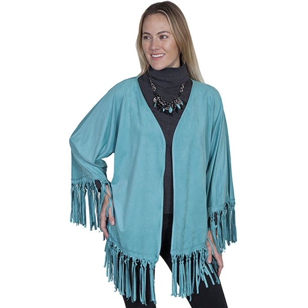 Womens Scully Shirt: Ladies Scully Western Shirt. Keep ropin' and ridin' in this long sleeve western women's shirt from Scully's Honey Creek collection. This wrap features an open front; long oversize sleeves with fringe cuffs; and knotted fringe hemline. HC261