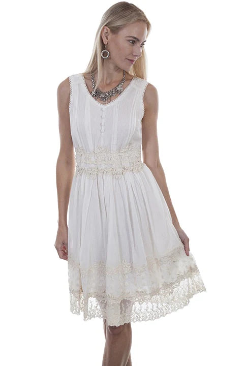 Cotton dress. The perfect pick for summer outings, this elegant cotton dress features a beautiful lace band at the waist. And a glamorous double band lacing around the hemline. 100% cotton. Dry clean only. Import.