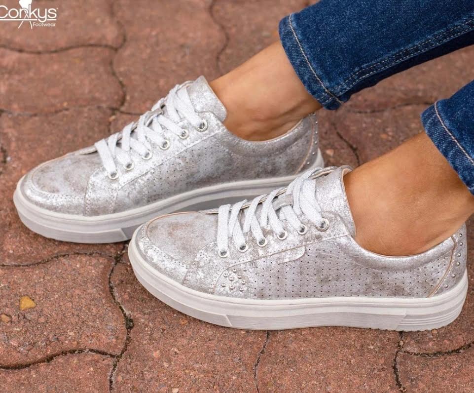 Corky's Hey Girl Down Time Silver Metallic Shoe is the perfect way to add a touch of glamour to your everyday look. The silver metallic color is eye-catching and modern, while the rubber sole provides comfort and support. The cushioned sole ensures that you'ss be able to walk or stand for hours without feeling any discomfort, and the slip-on design with laces makes it easy to get on and off. Whether you're dressing up for a special occasion or just wanting to add a little sparkle to your everyday outfit, Corky's Hey Girl Down Time Silver Metallic Shoe is the perfect choice.