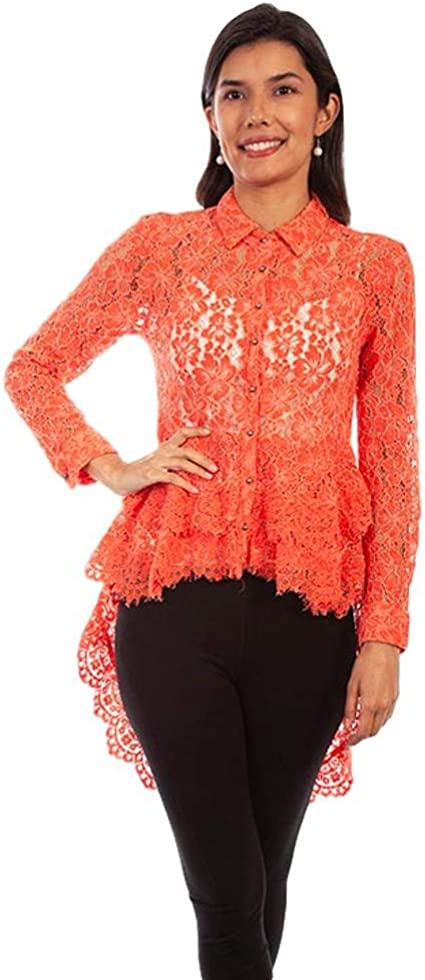 Color: Coral Nylon, Cotton Import Button closure Hand Wash Only Hi/lo lace button front blouse Double ruffle hemline Shell mesh 100% nylon, embroidery 100% cotton