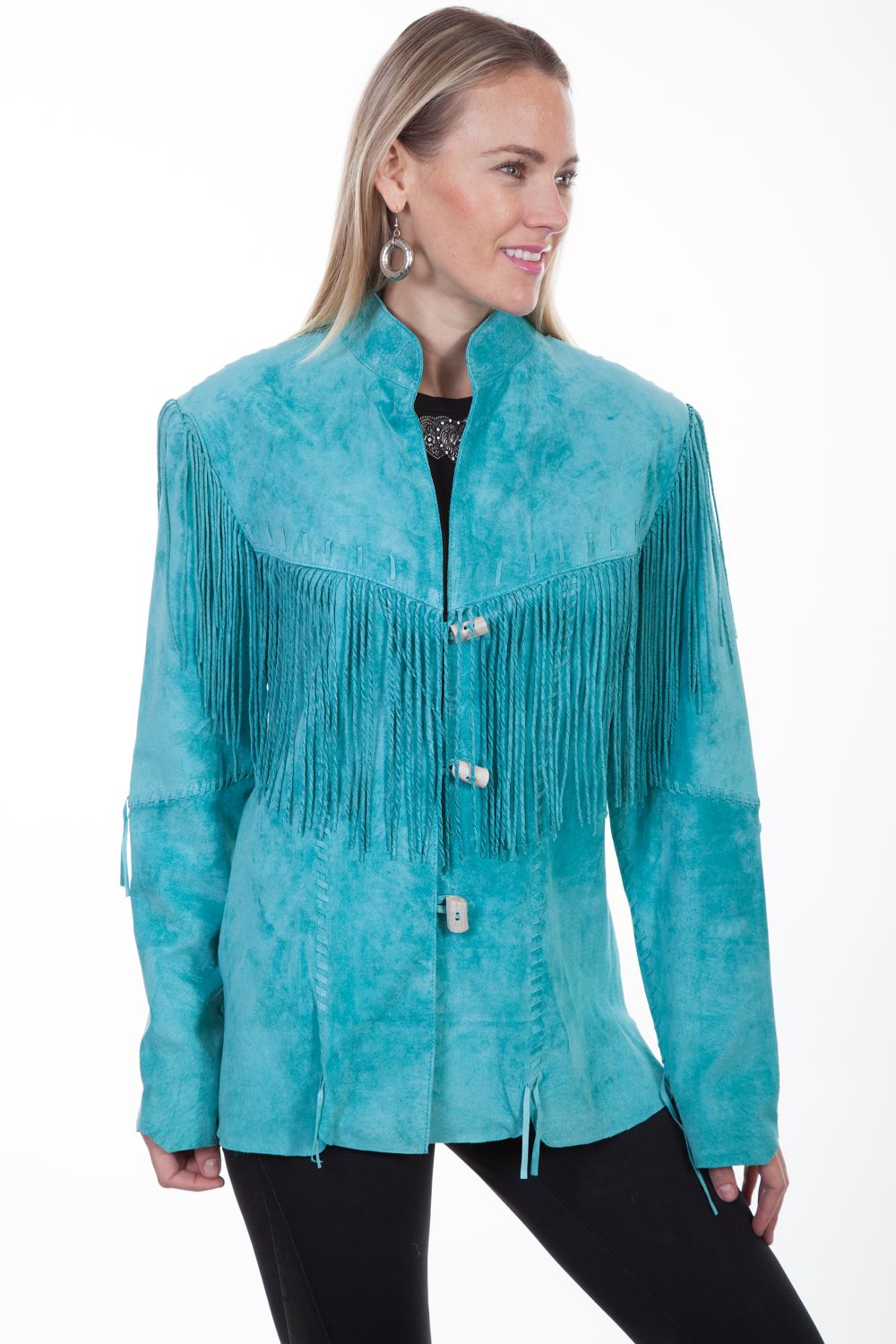 Boar suede fringe jacket designed to flatter. Hip length. Long fringe accented on front and back yokes and over the shoulders. Handlaced trim on seams front and back. Wooden toggle closures. Imported.