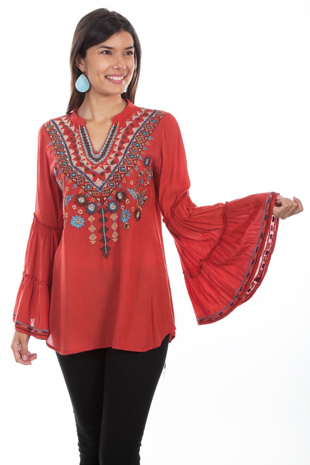 Embroidered v neck tunic. Exquisite peasant style tunic embellished with v shaped embroidered geometric bands spilling out to stylized florals. This relaxed fit tunic has a stand up collar and long oversized ruffled bell sleeves with an embroidered trim. Hand wash separately in cold water or dry clean.