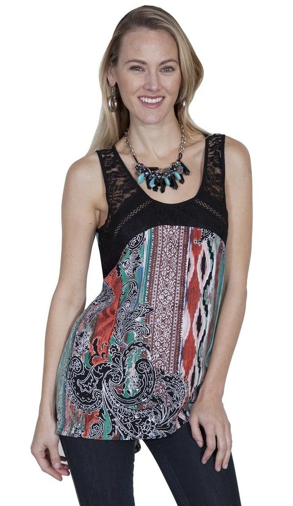 Womens Scully Shirt: Ladies Scully Western Shirt. Whoa, Nellie! Purchase this sleeveless western women's tunic from Scully's Honey Creek collection today. It features colorful print; contrast lace front yokes; and scoop neck. HC264